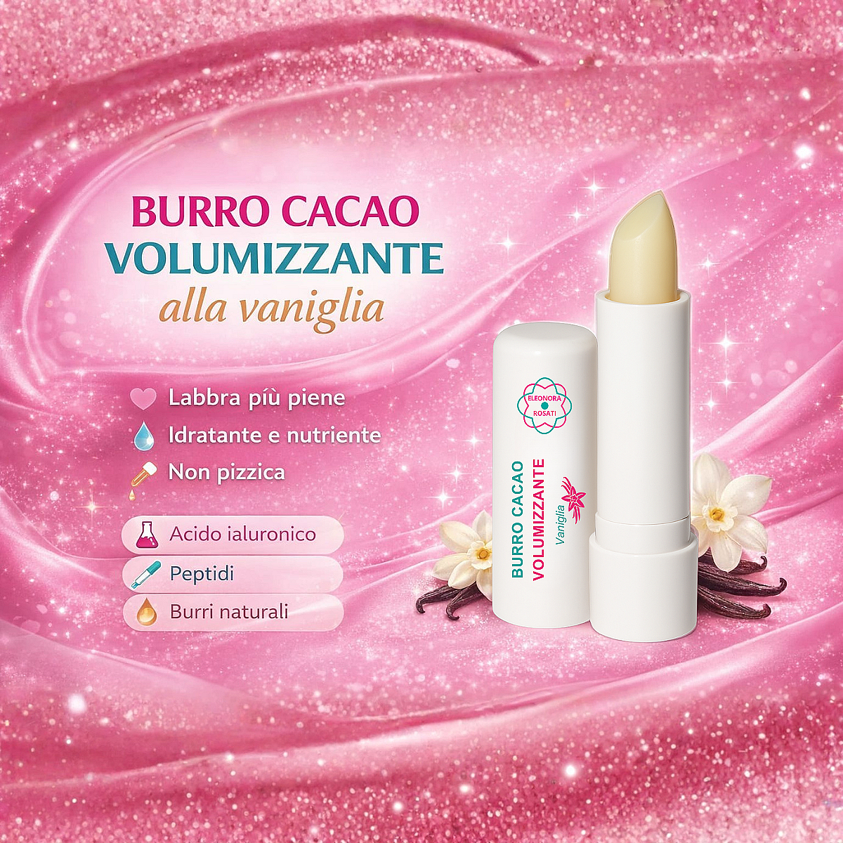 Il nostro Burro Cacao Volumizzante alla Vaniglia non è solo un burro cacao: è un vero e proprio trattamento cosmetico per le tue labbra, pensato per unire nutrimento intenso, idratazione e un delicato effetto glossato.