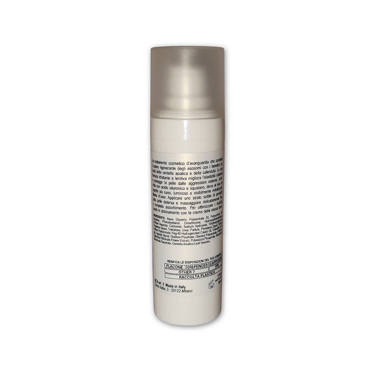 Siero viso innovativo e leggero che rappresenta il futuro della cosmetica rigenerativa, portando sulla pelle l’efficacia della scienza avanzata. Gli esosomi vegetali derivati dalla Centella Asiatica (10 milioni per ml di Centella Asiatica Leaf Vesicles) sono il cuore della sua formula, i quali agiscono come messaggeri cellulari che stimolano i processi di rinnovamento cutaneo, favorendo il trasporto in profondità dei principi attivi. Gli esosomi migliorano l’aspetto della pelle secca, danneggiata o disidratata, riducendo la desquamazione, ripristinando l’elasticità e riparando la pelle.